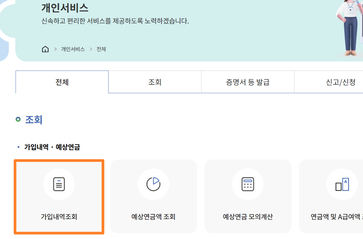 2. 개인서비스에서 [가입내역조회]로 들어가면 연금보험료, 납입개월, 납입된 금액 등등 살펴볼 수 있습니다.