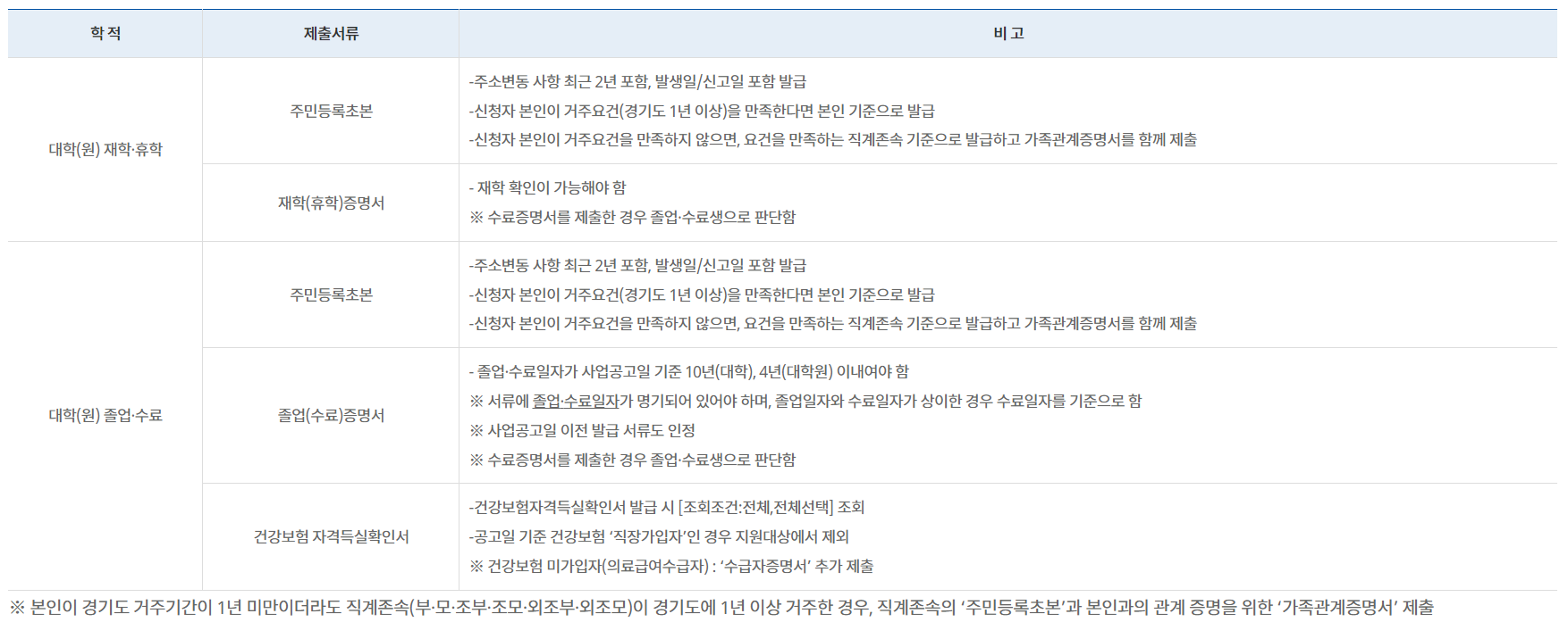 신청자 본인 또는 직계존속(부,모,조부,조모,외조부,외조모) 중 1명이 주민등록상 경기도에 사업공고일 기준 1년 이상 계속 거주 - 소득기준 :소득 무관 지원