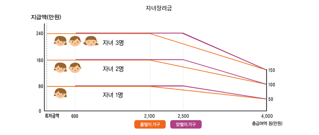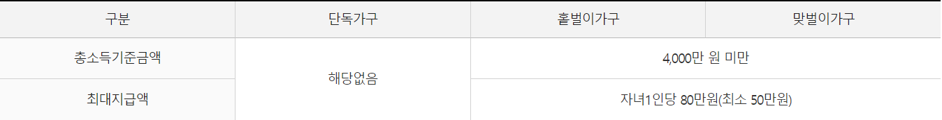 저소득 가구의 자녀양육을 지원하기 위해 총소득 4,000만원 미만이면서 부양자녀(18세 미만)가 있는 경우, 1인당 최대 80만 원(최소50만 원)을 지급하는 제도입니다.